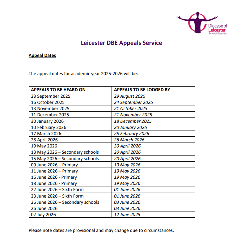 The Diocese of Leicester Board of Education administers our appeals and further information, including the relevant forms can be found on their website https://www.leicesterdbe.org/schools/admissions-and-appeals/